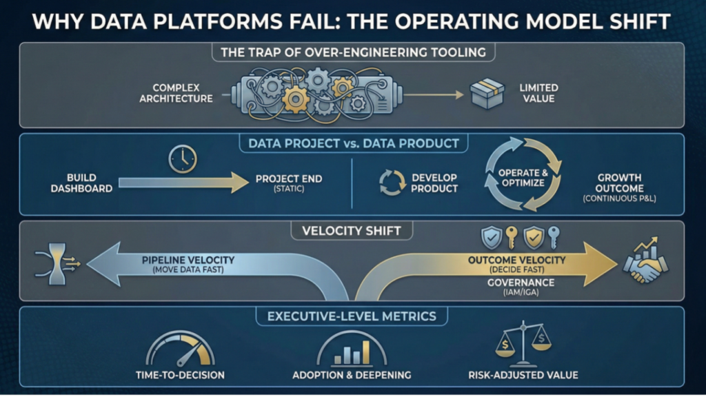 To shift this pattern, leaders must rethink four core assumptions: (i) stop over‑engineering architectures, (ii) move from project outputs to continuous value assets, (iii) prioritize outcome velocity over pipeline velocity, and (iv) anchor progress to executive‑level metrics that matter.